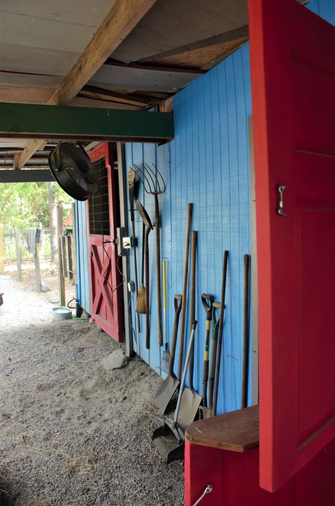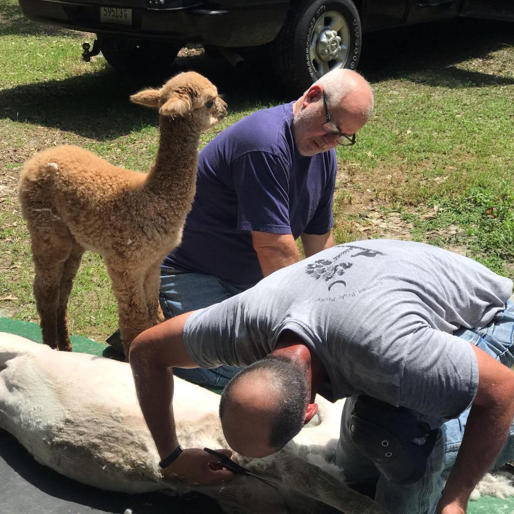 Stable AreaCharlie the RoosterEric Holbrook shearing Averra, May 2020; Hershey and Philip assisting